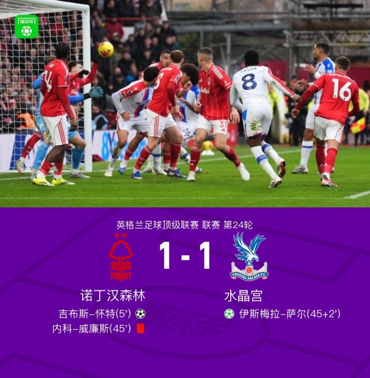 十人诺丁汉森林1-1水晶宫,威廉斯复制苏牙“门线扑救”被罚下