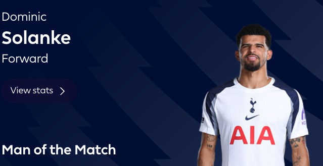 英超第24轮,热刺主场2-2战平曼城,此役上演梅开二度的热刺前锋索兰克当选全场最佳球员。