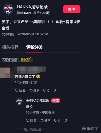 博主在社媒中写道:郭子,未来希望一切顺利!!!有球迷留言询问郭全博的下家,博主随后透露,这名球员选择退役。