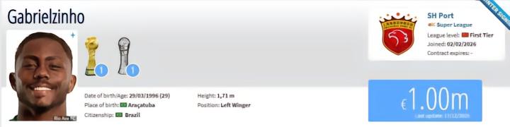 北京时间2月2日,德转更新,加布里埃尔正式加盟上海海港。