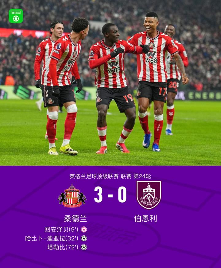 桑德兰3-0大胜伯恩利,塔勒比建功,哈比卜-迪亚拉破门