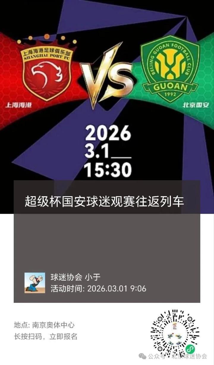 北京球迷协会表示:超级杯比赛正值春运及开学期间,为了保证国安球迷往返南京观赛,铁路部门正在研判通过加开编组,增大运力。推进开通了3月1日北京南9:03-12:29到南京南G43国安球迷观赛列车,3月1日南京南20点之后发车到北京南球迷列车,另外费用包括南京奥体中心前往南京南大巴车。