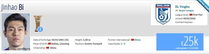 北京时间2月4日,德转更新,原山东泰山球员毕津浩正式加盟大连英博。