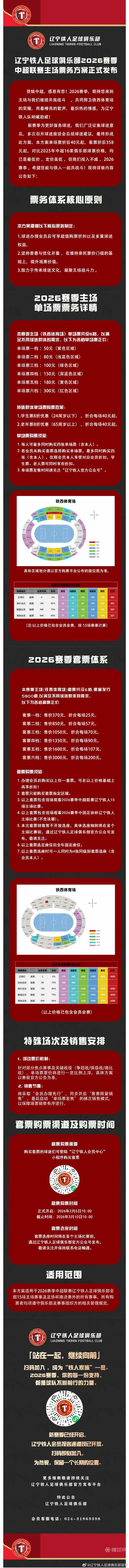 北京时间2月4日,辽宁铁人公布2026赛季中超主场票价,单场50-300元,套票370-3000元。