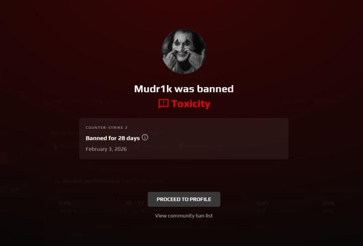 FACEIT随后对穆德里克作出处罚,判定其存在违反平台社区规范的行为,执行为期一个月的封禁。