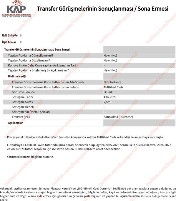 北京时间2月4日,费内巴切官方将坎特转会的详细信息公布在土耳其的公共披露平台(KAP),其中可以看到,坎特的签字费为1440万欧元,他的年薪是1100万欧元。