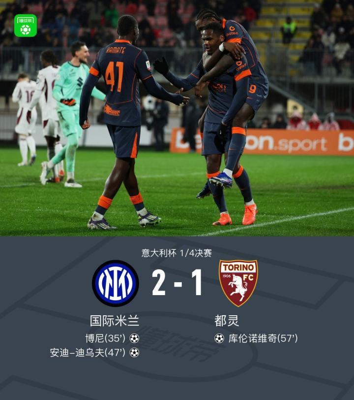 【意杯国米2-1都灵晋级4强,博尼、迪乌夫破门,图拉姆献助攻】