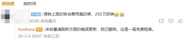 有球迷在朱艺的微博下留言:德转上面的转会费真的嘛,250万欧哎。随后朱艺回复:来自塞浦路斯方面的错误更新,我已删除。这是一笔免费租借。