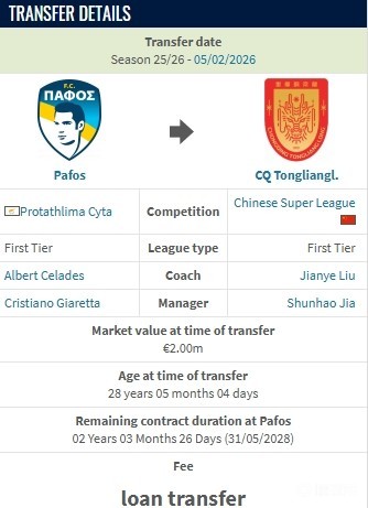 官方:重庆铜梁龙租借帕福斯前锋迪马塔