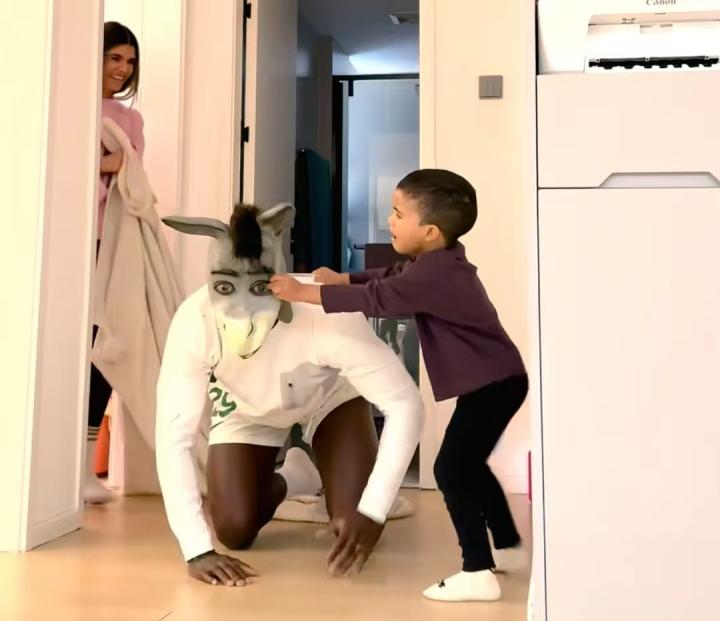视频中,法比奥头戴“驴头套”亮相,两个孩子似乎被吓到了,他的儿子上前试图将头套摘下。