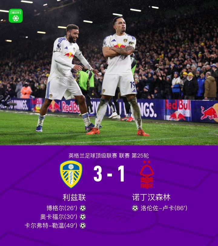 利兹联3-1诺丁汉森林,勒温、奥卡福尔、博格尔破门