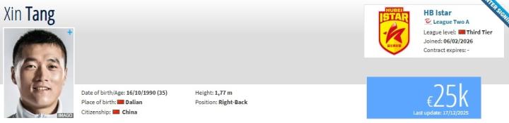 北京时间2月7日,德转更新,35岁原成都蓉城后卫唐鑫加盟湖北青年星。