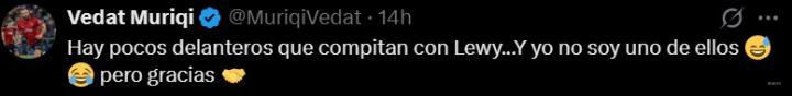 穆里奇也在社媒幽默地回应道:“能和莱万相提并论的前锋没几个……而我可不是其中之一啊,但还是谢谢了。”