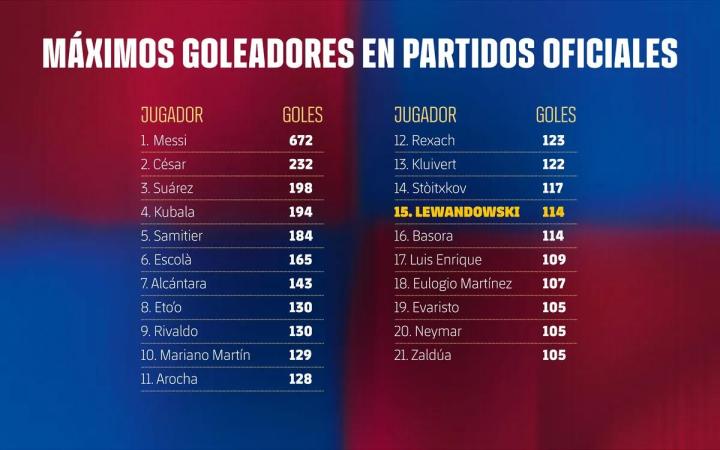 在与马略卡的西甲第23轮比赛中打入一球后,莱万巴萨生涯已打入114球,据巴萨官方统计,莱万升至队史射手榜第15位。