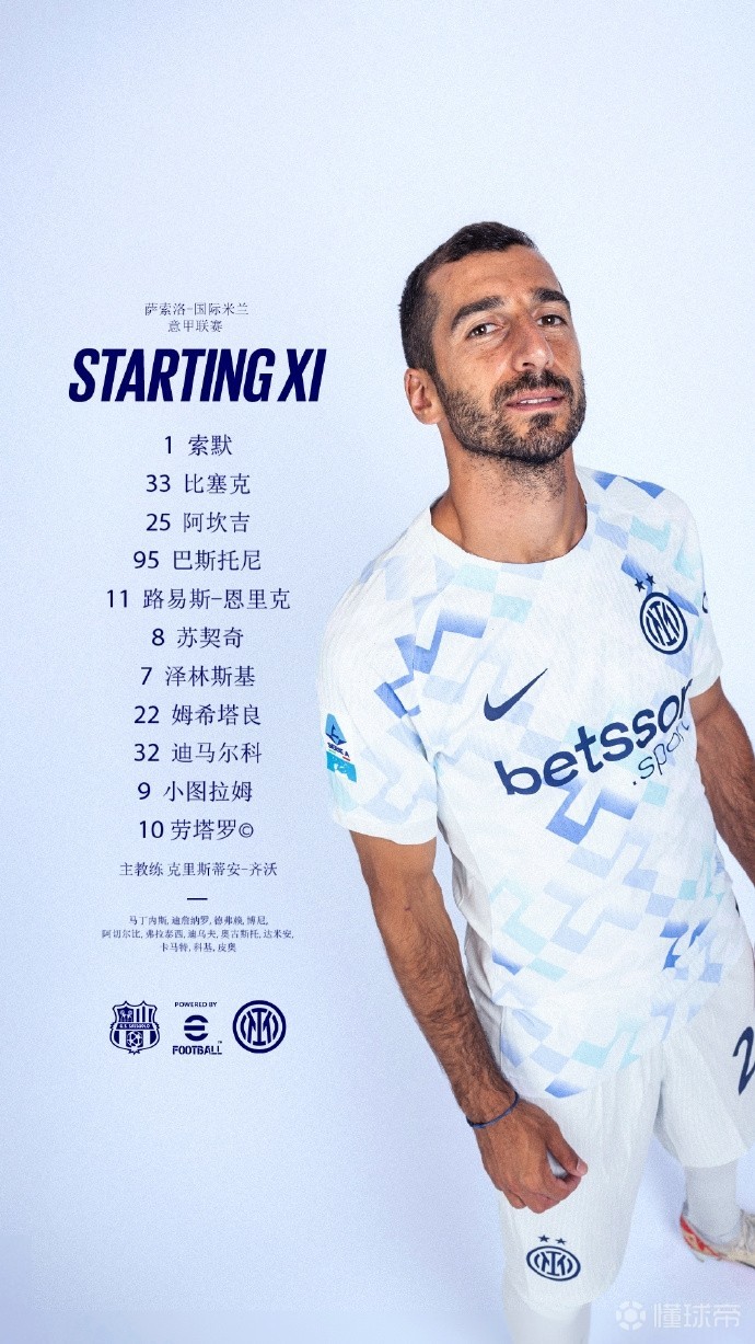 国米首发:1-索默、31-比塞克、25-阿坎吉、95-巴斯托尼、11-路易斯-恩里克、8-苏契奇、7-泽林斯基、22-姆希塔良、32-迪马尔科、9-马库斯-图拉姆、10-劳塔罗-马丁内斯