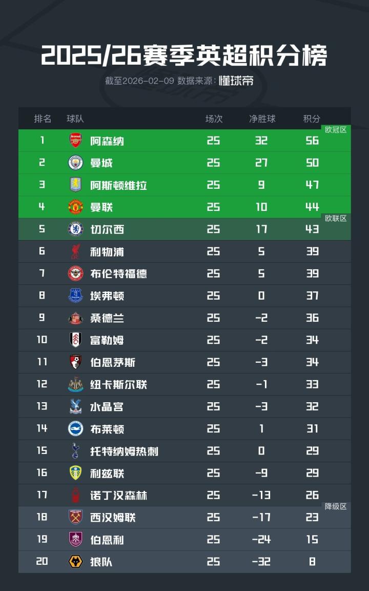 北京时间2月9日,2025/26赛季英超联赛结束了第25轮的全部比赛,积分榜的形势也产生了进一步的变化。
