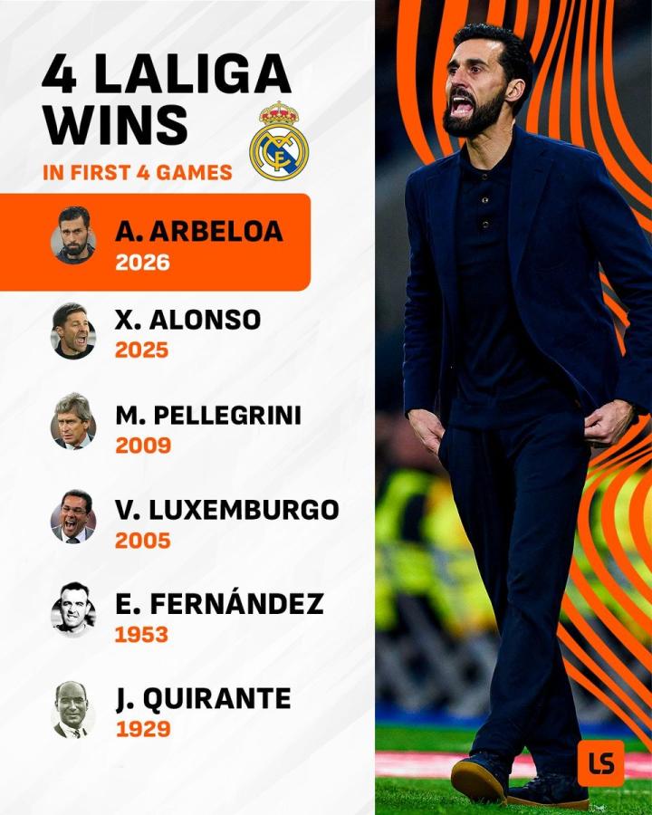 在带队客场击败瓦伦西亚后,阿韦洛亚成为皇马队史第六位执教球队前四场西甲比赛全部取得胜利的主帅,而他的前任哈维-阿隆索也做到了这一点。