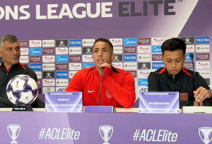 2月9日,成都蓉城与武里南联的赛前新闻发布会,球员罗慕洛随主帅阿洛伊西出席。