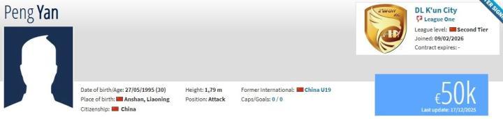 在2025赛季结束后,闫鹏与大连英博合同到期。现在他在德转上的身价为5万欧元。
