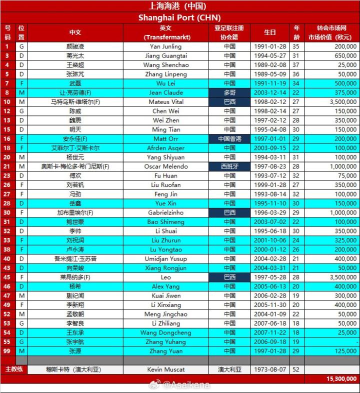 北京时间2月10日,德国转会市场亚洲区管理员朱艺@Asaikana 公布了上海海港队的亚冠名单,其中武磊回归,新援安永佳、杨希、克劳德等人在列。