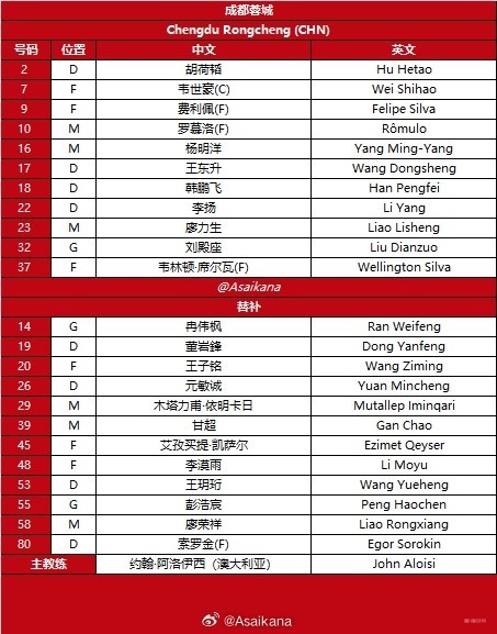 成都蓉城首发:32-刘殿座、2-胡荷韬、7-韦世豪、9-费利佩、10-罗慕洛、16-杨明洋、17-王东升、18-韩鹏飞、22-李扬、23-廖力生、37-韦林顿-席尔瓦
