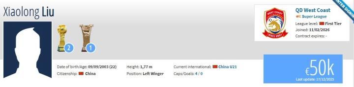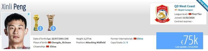 北京时间2月11日,德转更新,彭欣力、刘小龙加盟西海岸。