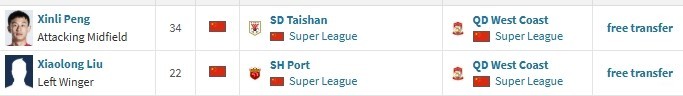 德转显示,彭欣力和刘小龙都为自由转会至青岛西海岸。