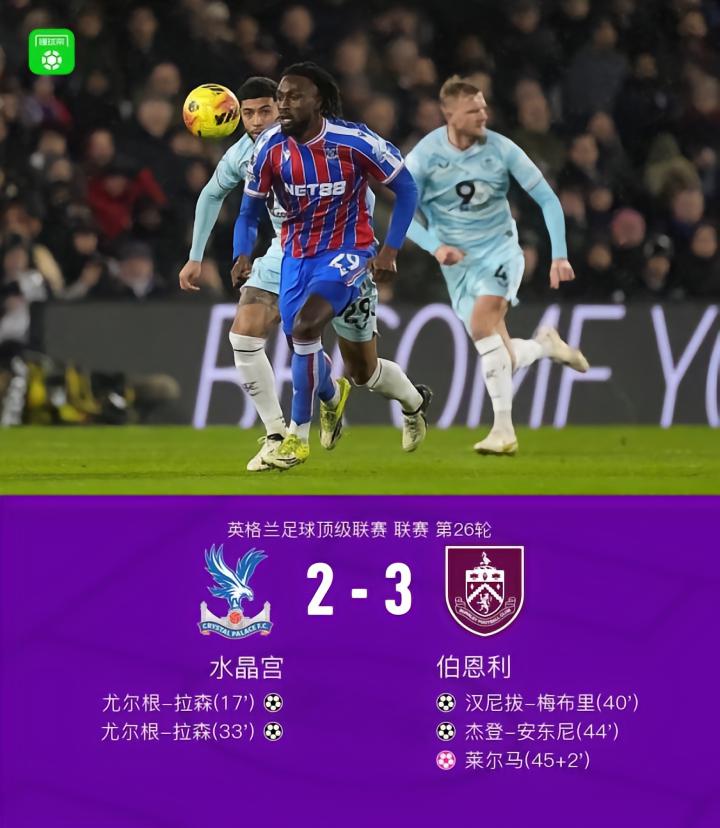 伯恩利客场3-2逆转水晶宫,尤尔根-拉森双响难救主