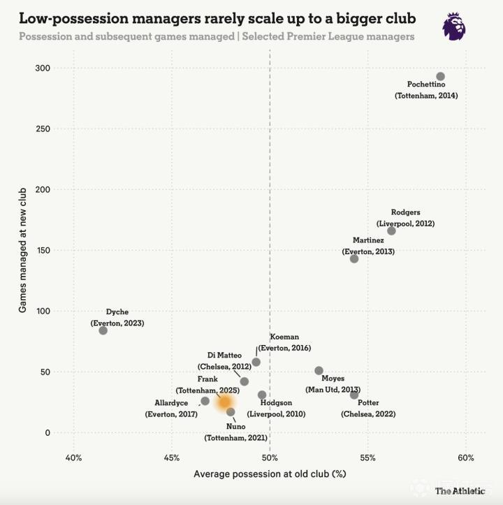 这一点可以通过数据略微量化。这里有一张稍显不同寻常的图表。它统计了那些从其他英超俱乐部跨入“大俱乐部”的主教练(大俱乐部定义为在英超征战超过15个赛季的俱乐部——阿森纳、切尔西、埃弗顿、利物浦、曼城、曼联和热刺)。横轴是他们在原俱乐部的平均控球率,这大致反映了战术风格;纵轴是他们在新俱乐部执教的场次,粗略衡量成功程度。