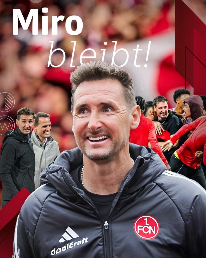 北京时间2月12日,纽伦堡俱乐部官方发布公告,宣布与球队主帅克洛泽续约。