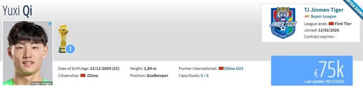 北京时间2月12日,德转更新,原南京城市门将齐雨熙加盟天津津门虎。