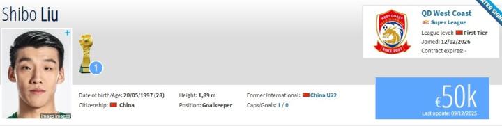 北京时间2月12日,德转更新,山东泰山门将刘世博自由转会青岛西海岸。