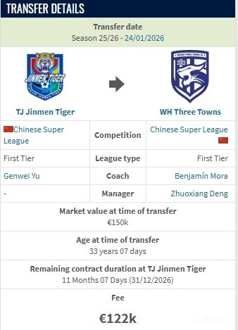 德转显示,方镜淇从天津津门虎加盟武汉三镇的转会费约100万人民币。
