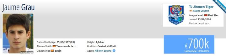 北京时间2月14日,德转更新,葡超阿维什镇中场豪梅-格劳加盟天津津门虎。