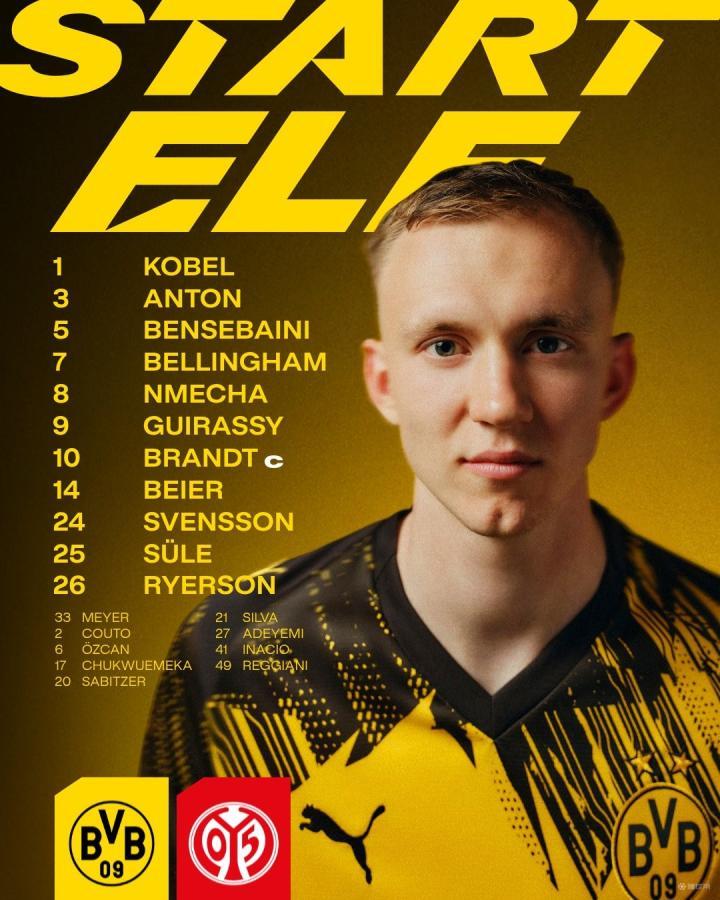 多特蒙德首发:1-科贝尔、3-安东、25-聚勒、26-瑞尔森、24-丹尼尔-斯文松、5-本塞拜尼、7-乔布-贝林厄姆、8-费利克斯-恩梅加、14-拜尔、10-布兰特、9-吉拉西