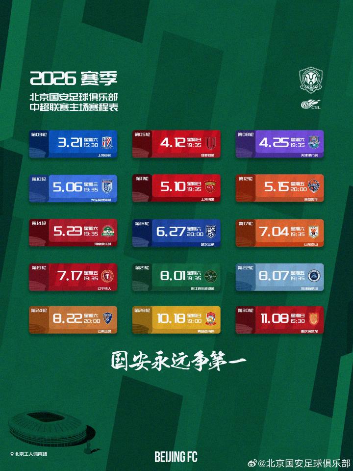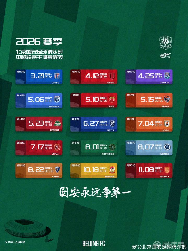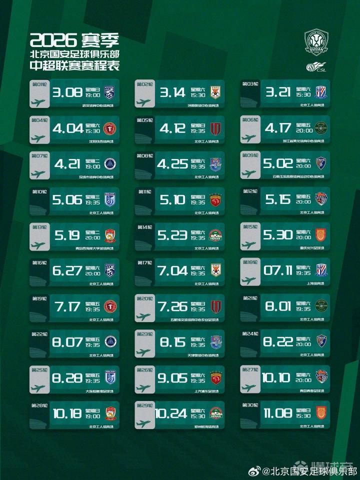 2026赛季中超联赛赛程公布,北京国安队将在第2轮客战山东泰山,第3轮迎战上海申花,第5轮迎战成都蓉城。