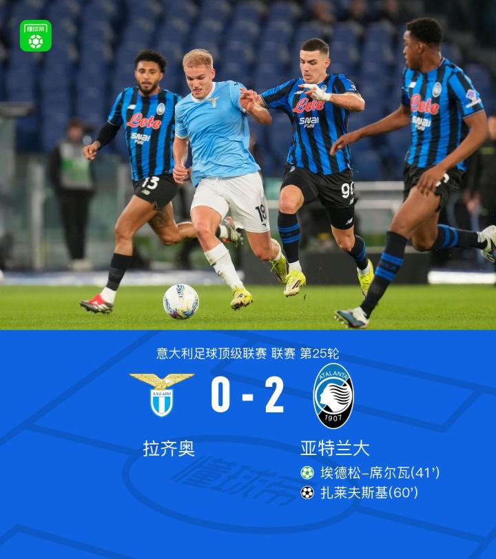 拉齐奥0-2亚特兰大,席尔瓦点射,扎莱夫斯基世界波