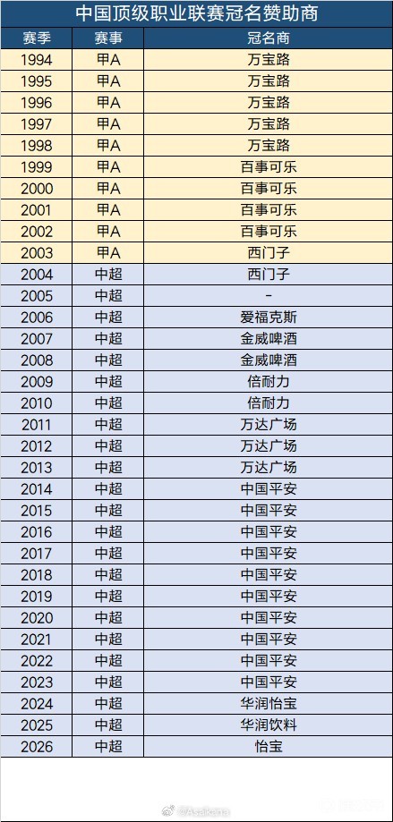 昨天中超官宣赛程时候,也把联赛冠名也一并官宣了。今年中超的冠名再次回到了“怡宝”,全称为2026怡宝中国足球超级联赛,英文为2026 C'estbon Chinese Football Super League。这是华润饮料连续第三年冠名中超联赛,但三年冠名名称都略有不同,2024为“华润怡宝”,2025为“华润饮料”,2026为“怡宝”。