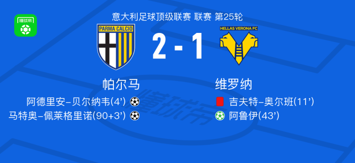 帕尔马2-1维罗纳,马特奥-佩莱格里诺、阿德里安-贝尔纳韦破门
