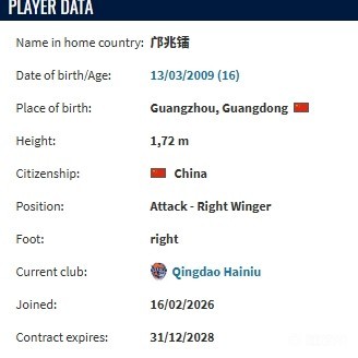 北京时间2月16日,德转更新,16岁前锋邝兆镭自由身加盟青岛海牛,双方签约3年。