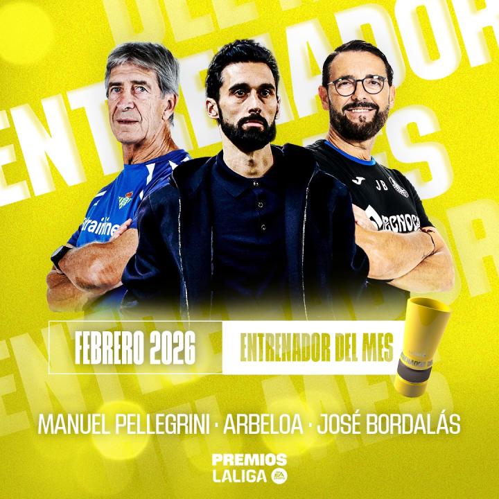 北京时间2月19日,西甲官方公布了2月份最佳主教练候选名单,分别是阿韦洛亚、佩莱格里尼和博尔达拉斯。
