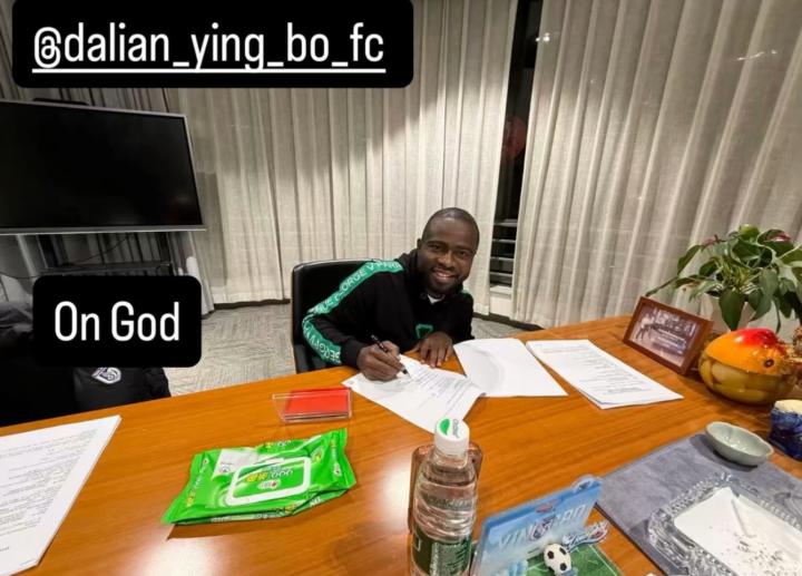 北京时间2月20日,阿奇姆彭更新个人社媒,晒出与大连英博俱乐部签署合同照。