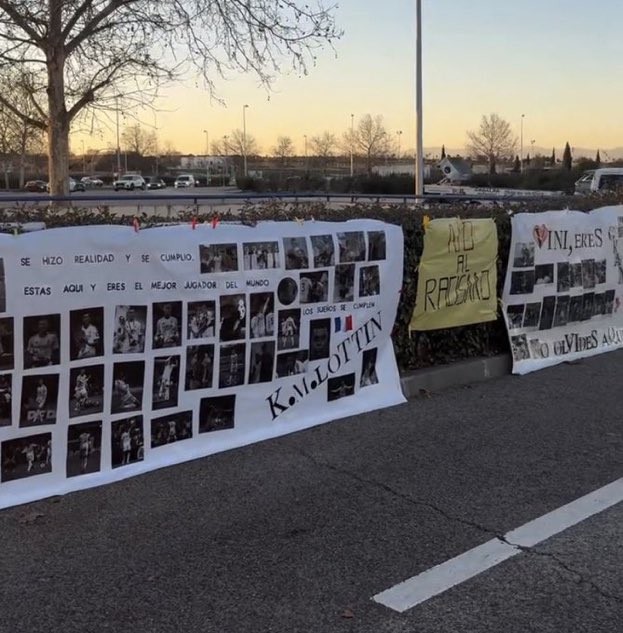 当地时间2月20日,皇马球迷在皇马体育城外悬挂横幅,声援维尼修斯与姆巴佩,力挺二人反对种族歧视的行为。