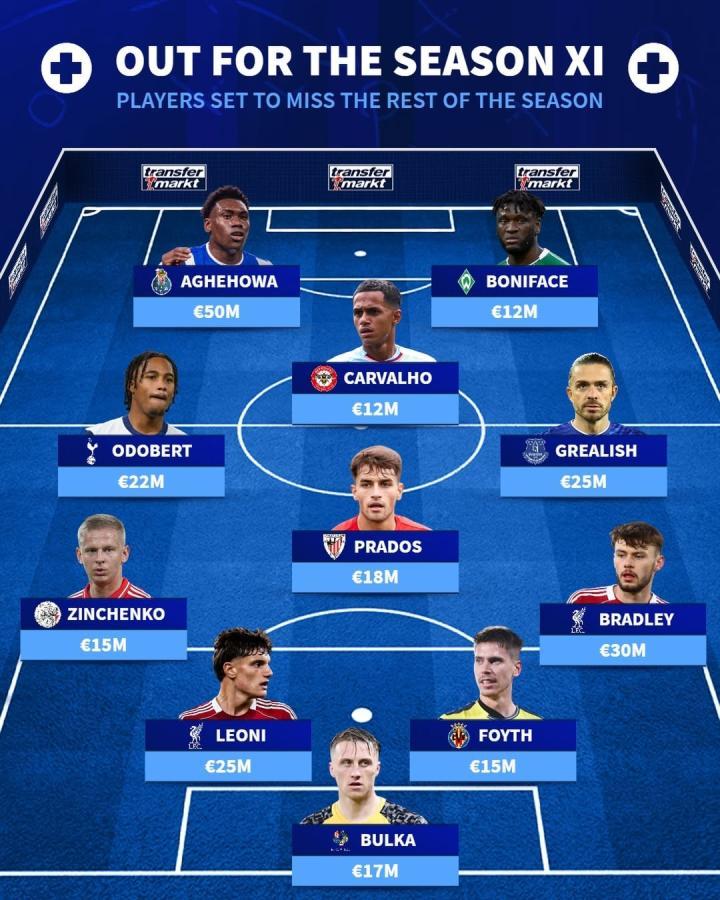 中场:贝尼亚特-普拉多斯(毕尔巴鄂竞技)、奥多贝尔(热刺)、格拉利什(埃弗顿)、法比奥-卡瓦略(布伦特福德)
