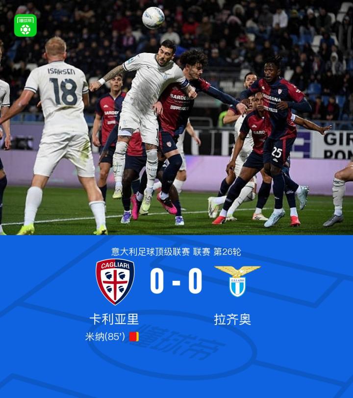 拉齐奥0-0十人卡利亚里,帕莱斯特拉破门被吹,米纳染红