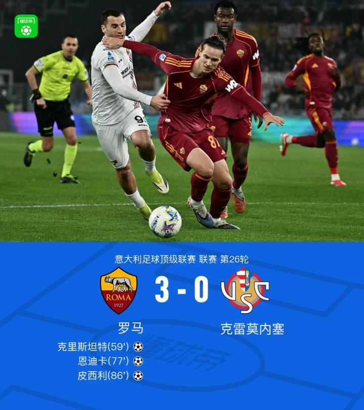 罗马3-0克雷莫内塞,克里斯坦特传射,恩迪卡建功