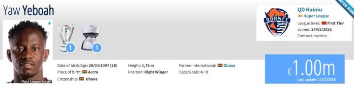 北京时间2月24日,德转更新,前加纳国脚边锋叶博亚自由身加盟青岛海牛,球员身价100万欧。