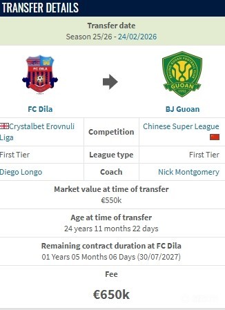 德转显示,孔特加盟北京国安的转会费为65万欧元,现在他的身价为55万欧元。