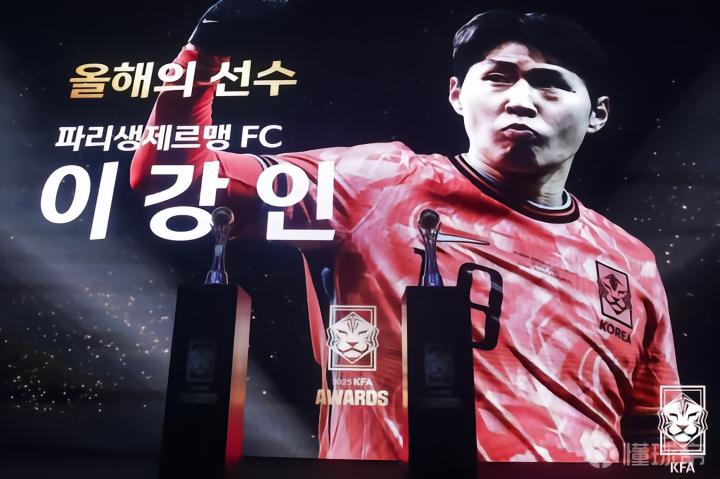 其中,效力于巴黎圣日耳曼的球员李刚仁当选韩国足协2025年度最佳男足球员。