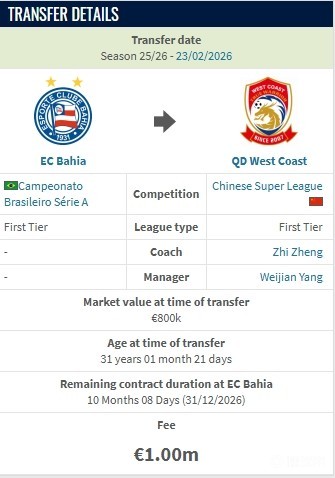 此前德转显示青岛西海岸新援雷森德转会费为100万欧元,对此德转亚洲区管理员朱艺已更正为自由转会,确认此前为巴媒错误报道。